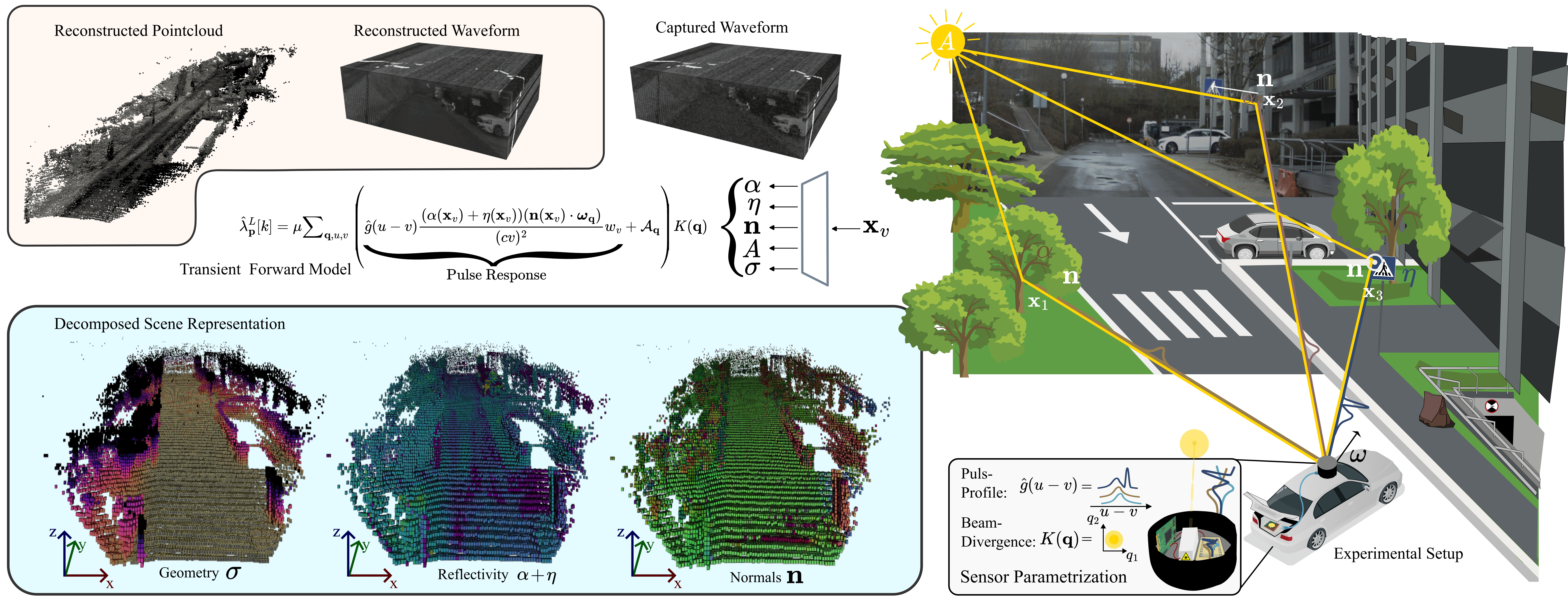 Transient data is re-rendered with an explicit image formation model that ingests these disentangled scene components as well as optimizable LiDAR sensor parameters. As shown on a sample of our custom dataset on the left, this approach enables to accurately recover fine-grained details of outdoor scenes recorded in varying conditions. The video confirms that our method can correctly disentangle the different scene properties. Specifically, Transient LASSO correctly estimates the road and car surface normals, the complex geometry of trees and roadside structures, as well as the high reflectivity of road markings and traffic signs.