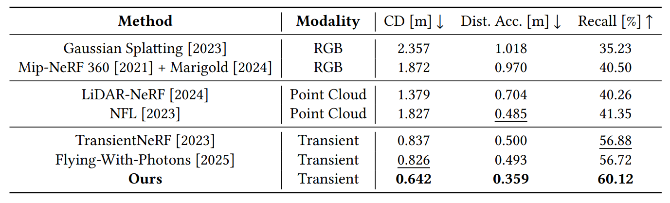 We evaluate the 3D reconstruction quality by comparing the ground truth with a pointcloud of the scene obtained by querying the fitted neural scene representation. As metrics, we use the Chamfer Distance (CD), Distance Accuracy and Recall, as reported on the table on the right. Our proposed method outperforms competing baselines operating on both raw (waveform) or processed (extracted pointclouds) and RGB signal.