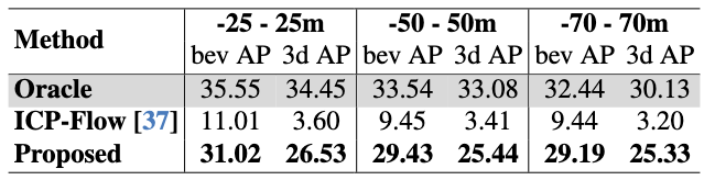 In the table on the right, following what done for the other pseudo labels, we train an off-the-shelf detector like PointPillars, using either 100% ground truth labels (Oracle) or a 20/80 ground-truth–pseudo mix generated by our method or by ICP-Flow. Due to higher quality and lower noise injected, our pseudo labels deliver near-oracle performance, outperforming the tested alternative pseudo-labeling techniques.