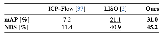 In the table on the left, We evaluate our pseudo bounding boxes performance on our highway long range dataset on a maximum range of 250 meters. We compare them with LISO, due to the similar detection-trajectory-refinement methodology, and ICP-Flow, an annotation-free pseudo-labeling method, showing the higher quality of our detections.