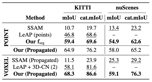 In the table on the left, we evaluate our semantic pseudo-labels on SemanticKITTI validation sequence 08 and on more than 40 thousands samples of NuScenes, generating them using only the front-left camera for the former and all six cameras for the latter. We evaluate and compare our pseudo labels against LeAP and Semantic SAM: for a fair comparison we as well consider only labeled points and reduce the number of classes to a set of 11 classes. Results highlight how our pseudo labeling function is the most accurate in labeling LiDAR data. To further compare with LeAP, which propagates its initial labels on a 0.2 meters voxel grid, we voxelize our propagated labels at the same resolution and compare with the reported best result. Thanks to the higher point-level accuracy of our propagation technique, our voxelized predictions outperform all competing methods.