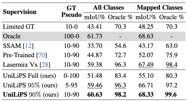 In the table on the right, we then train a PVKD model on a mix of ground-truth and pseudo labels. We keep all hyperparameters fixed and vary only the supervision source: in the Oracle case we use 100% ground-truth labels; for Limited GT a randomly chosen 10% ground-truth subset; for Our we feed that identical 10% subset plus 90% pseudo labels generated by our pipeline. We follow the same procedure and train PVKD on a 10-90 mix of ground truth and pseudo labels generated using state of the art methods like Semantic SAM, Lasermix and a pre-trained Cylinder3D model (simulating automatic labeling). Our pseudo labels achieve near-oracle performance, with a mean mIoU gap of just 1.09%, or 0.30% when excluding classes not predicted by our method. Notably, ours is the only approach that operates successfully in the 0–100 regime where competing baselines still require some ground-truth input.